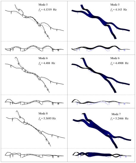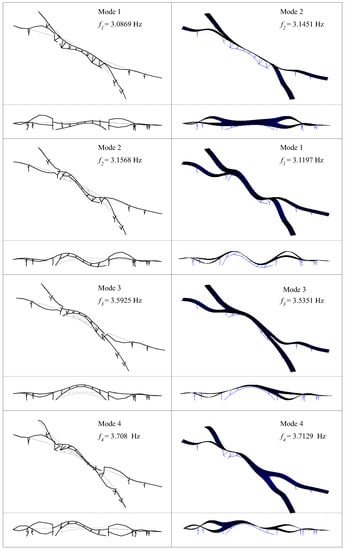 Table 8 reports the Modal Assurance Criterion (MAC) values between B and S mode shapes, calculated for the vertical component of the first eight modes. It can be observed that MAC values are very close to unity for modes 3 to 6. Some modes are ordered differently in the B and S models, e.g., mode shapes 1 and 2 present close natural frequencies, and they are reversed in the B model with respect to the S model. This is confirmed by MAC values, which are above 0.9 when mode 1-B and mode 2-S are considered (and vice versa). MAC values also highlight a high correlation between mode 8-B and mode 7-S. In this case, there is no evidence of mode inversion, i.e., it is not possible to identify a similarity between mode 7-B and mode 8-S. For a better comparison, Figure 12 and Figure 13 plot the modes that have the same mode shape in both models on the same row.