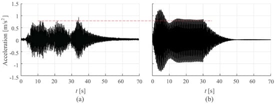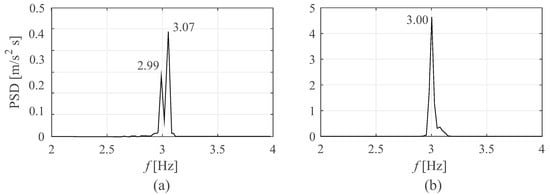 Figure 14 plots the numerical time history of the vertical acceleration at a quarter of the south-east leg in comparison with the one measured by Sabato []. The numerical response is much more regular than the experimental one. Actually, the perfectly periodic force model is not able to capture the inter- and intra-subject variability [,] that characterize pedestrian excitation. Moreover, the applied force does not account for human–structure interaction and for the related damping effect induced by human bodies []. Because of these two factors, the numerical structural response overestimates the experimental one by about 12.5% (if the initial peak due to transient, at around 5 s, is neglected). The comparison between Power Spectral Density (PSD) functions of the experimental and numerical response is shown in Figure 15. In the experimental results, peaks at both the bridge frequency and at pedestrian frequency are detected. On the contrary, the numerical PSD is concentrated on one single peak at the excitation frequency.