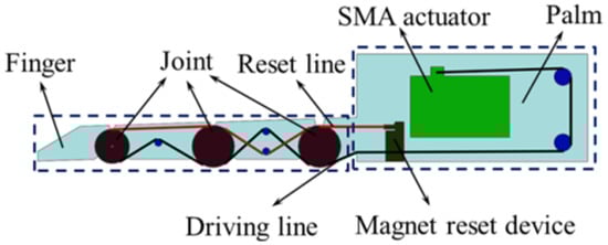 Figure 3 shows the internal structure of the robotic finger. Each finger is actuated by one SMA actuator. The SMA actuator is linked with the joint to achieve one freedom bending motion. Therefore, the finger has an underactuated motion mode. The novel part of the SMA-based robotic hand is the magnet reset device. The magnet reset device is connected with the joint to ensure the finger to restore original position.