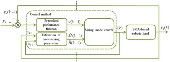 The schematic diagram of the control system is shown in Figure 5. The proposed control method merely depends on the I/O data. According to the reference output and the output of the SMA-based robotic hand , the transformed error can be obtained. According to the I/O data of the SMA-based robotic hand, the estimation of time-varying parameters and can be obtained. Then, through sliding mode control, we can get the control input .