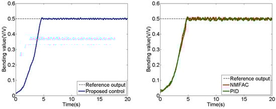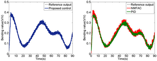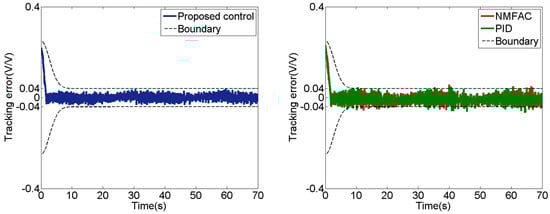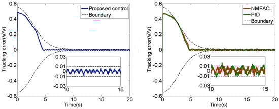 From the results in Figure 10 and Figure 11, the three control methods can track the reference signal. However, PID and NMFAC cannot ensure the tracking error in a limited boundary. The proposed method can constrain the tracking error within a predefined domain.