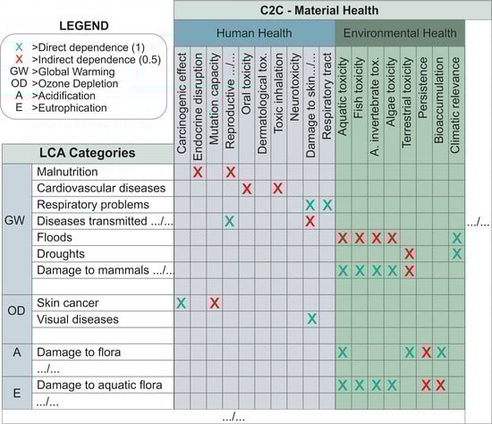 Once the similarities between the categories of both methodologies were identified, the related relationships were classified and quantified to create the LCA+C2C endpoint indicators. Relationships were evaluated at two levels: (1) direct, if there was direct dependence between the input (C2C) and output (LCA) indicators, considering a direct dependency relationship to be when both methodologies evaluate the same aspect, although these identify the criteria with different names; and (2) indirect, if there was indirect dependence between the input (C2C) and output (LCA) indicators, considering indirect dependence to be when the evaluated aspects present common characteristics, but the indicator is not coincident.