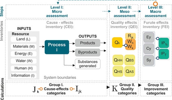 The development of the new assessment categories and their classification determined the need to design a flow of information and data, grouped into three inventories of results: (1) Cause Effects Inventory (CEI), (2) Quality Effects Inventory (QEI) and (3) Future Effects Inventory (FEI). Thus, the assessment process is carried out at three sub-stages: micro-, meso- and macro-assessment levels (see Figure 3). In these three stages, the sets of results are obtained, covering both eco-efficiency indicators (CEI and QEI) and eco-effectiveness indicators (QEI and FEI).