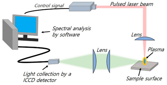 Figure 2 shows a schematic diagram of a LIBS setup and data collection method for plasma samples. The LIBS method does not require pre- or post-treatment of the sample, or a vacuum environment, and thus analysis is possible at normal pressure and room temperature. It is also possible to measure a wide range of elements regardless of the state of matter, and it can be seen that measurement is largely non-destructive because it is possible to analyze even minor elements in the range of several nanograms to micrograms [].