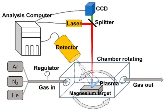 The experimental setup is shown in Figure 3. To examine the effect of gas flow on plasma, a flow device using a chamber was designed. In a rectangular acrylic chamber with a width of 50 mm, length of 50 mm, and height of 30 mm, three gases (Ar, N2, and He) flowed over the specimen in one direction. Plasma was generated by irradiating the specimen with a laser beam, and the spectral signal from the plasma was measured. The flow direction of the gas and incident path of the laser were both set up vertically, with the left side of the chamber set to 0°. The inlet flow direction of each gas flowing in the chamber was changed to 360° by rotating 30° counterclockwise from this reference point. The direction of gaseous flow induced by the influence of the outer wall of the chamber and the interference of the specimen setup for LIBS measurement did not match the direction of the surface on which the specimen was placed. Therefore, by changing the direction of the inlet flow by 360° and analyzing the resulting LIBS spectrum, meaningful results regarding the correlation between the gas flow and LIBS signal could be derived. This step was included in order to determine the inlet and outlet directions of the flowing gas, which showed a similar tendency to the modeling results. Through this process, it was possible to proceed with analysis of the change in signal of the LIBS according to the characteristics of the flow. The flowing gas was maintained at a volumetric flow rate of 300–420 cm3/s inside the chamber; in this state, plasma was generated on the specimen through the laser. Generating plasma by focusing a laser beam directly into the flow stream without any solid target is ideal for verifying the relationship, but this requires a high-quality, high-energy laser beam source. In addition, it is relatively difficult to maintain consistency in terms of the generation of plasma in the flowing gas during the experiment.
