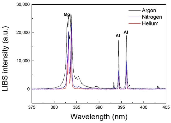 In elemental measurement using LIBS, plasma induced by laser ablation plume can change shape depending on the ambient atmospheric pressure []. In addition, the plasma itself is also affected by the type of atmospheric gas [,]. In a He gas atmosphere, the plasma is cooled so that the signals of the induced plasma atomic and ion emission lines are limited. In addition, in an Ar gas atmosphere, the temperature of the plasma increases, thereby amplifying the signal. Thus, laser-induced plasma interacts with the surrounding gas [,].