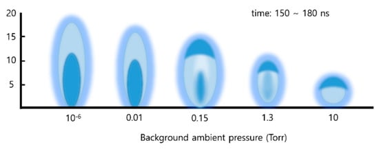 Harilal et al. reported that the size and shape of laser-induced plasma are affected by ambient atmospheric pressure []. Plasma generated on the surface of a material by a laser goes through the stages of generation, diffusion, and extinction. In previous studies, the size of plasma was represented schematically (as shown in Figure 6) according to time and ambient pressure []. In this study, the shape of plasma after 0.1 μs had elapsed under atmospheric pressure was used as a model, and for simplicity of calculation, the plasma was assumed to be a cylinder with a diameter of 1 mm and height of 10 mm.