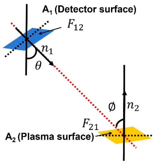 The most widely used methods for deriving shape factors include direct integration [], ray casting [], and the Monte Carlo method []. In this study, the shape factor was modeled using a direct integration method. The objects in the model are a plasma and a signal detector, which are assumed to be related as two blackbody radiators. The plasma has an area of A1 and the signal detector has an area of A2, taking into account the radiation between the two. The two objects are separated by a distance r, and the normals (n1, n2) on the surface of each object have angles of  and  with respect to the line connecting them (Figure 7). The shape factor between two surfaces is determined by integrating over the entire area of these bodies using the following Equation: