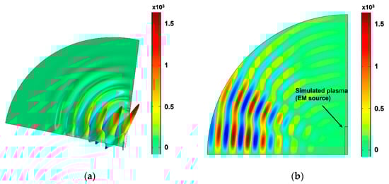 Commercial software (Multiphysics; COMSOL) was used to confirm the propagation of electromagnetic waves, and to calculate the magnitude of the electromagnetic field signal at a specific location. The simulation was conducted by setting the electric field source corresponding to the plasma at the left boundary of the quadrant and emitting an electric field from the source (Figure 10a). The magnitude of the superimposed wavelength of the electric field wave at nine positions, separated by a zenith angle of 1/4 arc of the electric field radiated from the source, was calculated. The governing equation used in the simulation was as follows:
