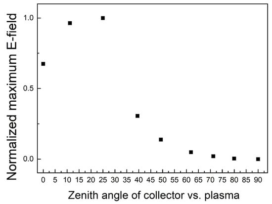 Figure 11 shows the maximum intensity value of the electric field, calculated by dividing the boundary of the quadrant into nine equal parts. The calculated electric field was normalized based on the intensity in the quadrant relative to the electric field intensity at the source. For modeling, the observation direction of the signal detector and plasma was set to a zenith angle of 0°–90° with respect to the point of plasma generation. The peak intensity of the electromagnetic wave generated from the linear source increased to approximately 24.35% as the observation direction changed from 0° to approximately 35°, and decreased thereafter. The minimum value was about 4.27% at a zenith angle of 90°. In addition, regarding the change of the electric field signal, an increase was calculated between 0° and 35°, followed by a decrease above 35°. Thus, when there is a change in the shape of the plasma due to flow, the signal value changes according to the relative position of the detector. From these results, a specific relationship can be inferred between the plasma signal acquired and position of the detector. In addition, it can be expected that the change in plasma shape, induced by flow, will appear similar to the change in electric field signal according to the amount of flow.