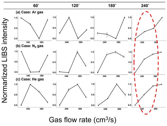 LIBS signal intensity by flow rate for various inlet port directions; (a) Ar, (b) N2, and (c) He gas.