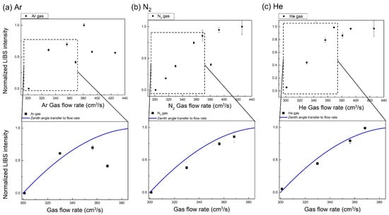 LIBS spectral line intensity according to the flow rate and trends in signal intensity obtained through modeling; (a) Ar, (b) N2, and (c) He gas.