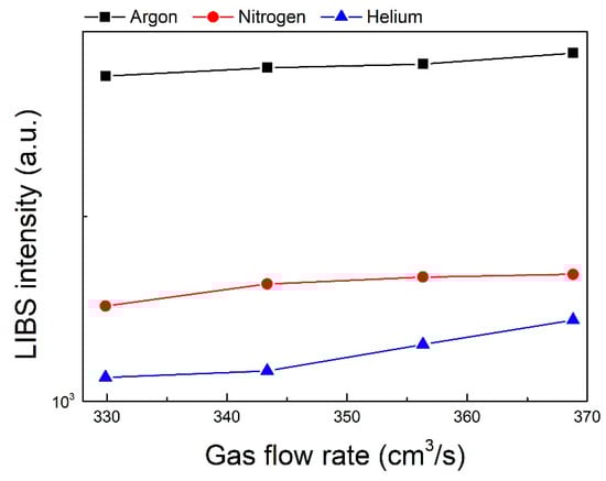 Comparative analysis of the signal strength according to the flow rate of each gas was performed (Figure 14). Under the same conditions, the LIBS signal strength was highest with Ar gas and lowest with He gas. Ar gas raised the temperature of the plasma, and LIBS signal intensity increased accordingly. On the other hand, He gas lowered the temperature of the plasma, and thus the absolute signal intensity was low.
