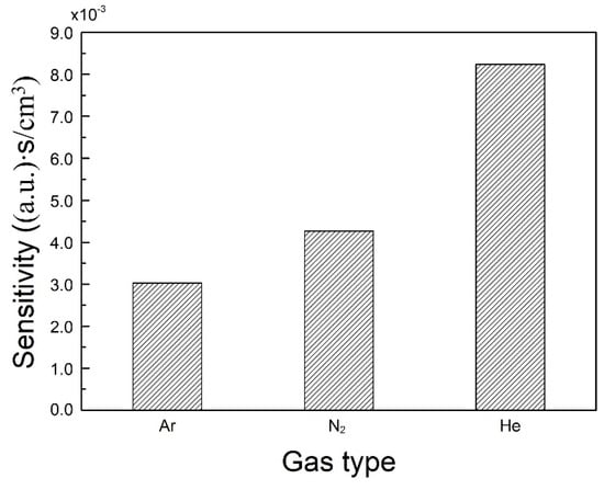 The ratio of the increase in signal strength to the increase in gas flow rate can be used to quantify the measurement sensitivity for each gas. N2 was regarded as an atmospheric gas. For Ar gas, this ratio had a value of 3.03 s/cm3. In the case of He gas, the ratio was 8.24 s/cm3 (Figure 15). Considering N2 as the reference atmospheric environment, the measurement sensitivity for Ar was low and that for He gas was high. Therefore, we concluded that the change in plasma according to gas flow can be measured relatively easily when using He gas. In the overall analysis, the ratio between the magnitude of the LIBS signal and the gas flow rate was reliable within a limited gas flow measurement range. It should be noted that the flow is greatly affected by the external environment in actual applications, and therefore the results should be adjusted to obtain valid experimental values.
