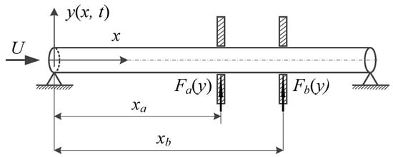 A dynamic model for a drill string system, conveying pulsating fluid on a simply supported pipe, is developed in this section. The equations of motion, without taking into account the effect of motion constraints, are provided in [,,]. As shown in Figure 1, based on the motion equation, considering the effect of support constraints [], the cubic nonlinear spring forces Fa(y) and Fb(y) are used to simulate the reaction force [], and the fluid–structure coupling motion differential equation of the drill string system is obtained, as follows: