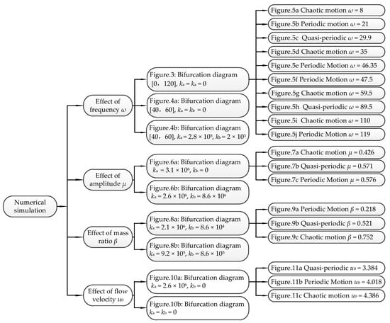 - As mentioned above, with the increase in the mass ratio β and flow velocity u0, the intensity of chaotic motion increases, and the system exhibits periodic and quasi-periodic responses and chaotic motion. Moreover, under certain combinations of supporting stiffness, periodic motion increases and the chaotic region shrinks.