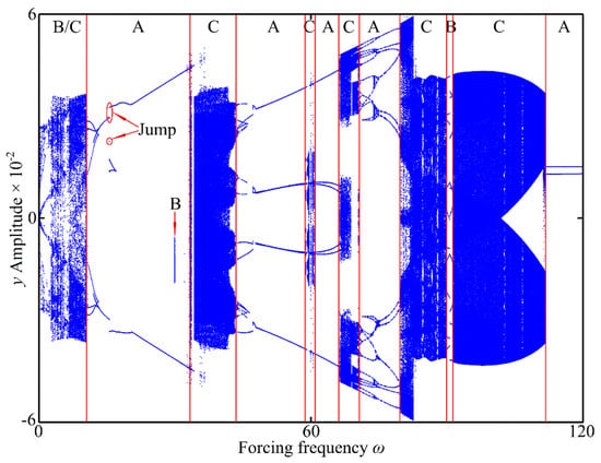 Bifurcation diagram of system response with ω, ka = kb = 0 (A: periodic motion; B: quasi-periodic motion; C: chaotic motion).