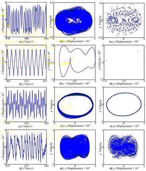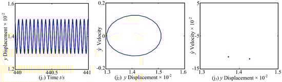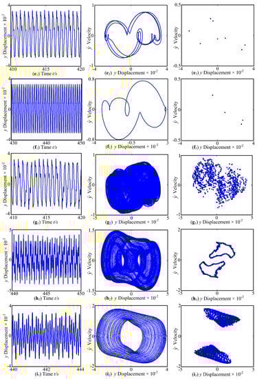 Figure 5(e1–e3) presents the periodic-8 motion, which is due to the presence of eight points in the Poincaré map at ω = 46.35. When the increased excitation frequency is ω = 47.5, as shown in Figure 5(f1–f3), the system motion state is periodic-4 motion, and four points exhibit in the Poincaré map. With the increase in ω, the system shows chaotic intermittency motion at [57.75, 60.75] in Figure 3. Figure 5(g1–g3) shows the dynamic response of the system when ω = 59.5, the observation shows that the system is in chaotic motion. Further increasing the forcing frequency ω, the system displays strong non-linear characteristics, the vibration amplitude significantly increases and periodic motion, quasi-periodic motion and chaotic motion appear at [66.25, 120]. The system again displays the phenomenon of period-doubling reverse bifurcation in the range of [70.55, 79.75]. In the range [89.5, 91.25], a narrow quasi-periodic motion is observed, as shown in Figure 5(h3), and two closed circles are exhibited in the Poincaré map. The dynamic characteristics of the system at ω = 110 are displayed in Figure 5(i1–i3). It can be found that the system has obvious chaotic characteristics. Figure 5(j1–j3) presents the periodic-2 motion at ω = 119 via waveform, phase diagram and Poincaré map.