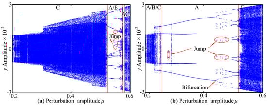 Bifurcation diagram of system response with μ: (a) ka = 3.1 × 106, kb = 0; (b) ka = 2.6 × 106, kb = 8.6 × 106 (A: periodic motion; B: quasi-periodic motion; C: chaotic motion).