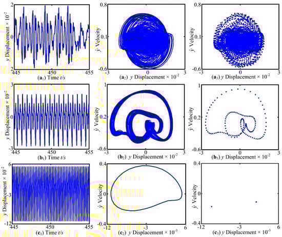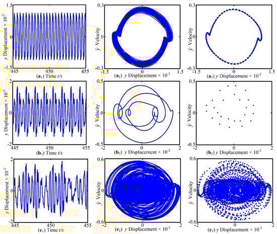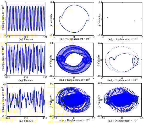 Under different support stiffness conditions, the influence of the perturbation amplitude μ on the dynamics characteristics of the system is analyzed. The corresponding bifurcation diagrams, with μ as the control parameter at [0.2, 0.6], are shown in Figure 6. The response of the drill string system at ka = 3.1 × 106 and kb = 0 is demonstrated in detail in Figure 6a. The system shows chaotic characteristics at [0.2, 0.5225], and the intensity of chaotic motion is increased. Figure 7(a1–a3) shows the waveform, phase diagram and Poincaré map of the system at μ = 0.426, at which point the system has chaotic motion. With the increasing perturbation amplitude μ, the system shows periodic motion and quasi-periodic motion. The jump discontinuous non-linear phenomenon appears at (0.5225, 0.5745), and the system dynamic response is shown in Figure 7(b1–b3) at μ = 0.571. As can be seen in this figure, the system exhibits quasi-periodic motion. With the further increase in the perturbation amplitude, the motion of the system is a narrow period-2 at [0.5475, 0.5805]. As shown in Figure 7(c1–c3), period-2 motion is observed at μ = 0.576.