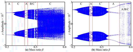 Bifurcation diagram of system response with β: (a) ka = 2.1 × 106, kb = 8.6 × 104; (b) ka = 9.2 × 105, kb = 8.6 × 105 (A: periodic motion; B: quasi-periodic motion; C: chaotic motion).