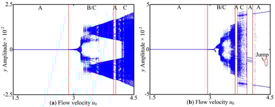 Bifurcation diagram of system response with u0: (a) ka = 2.6 × 106, kb = 0; (b) ka = kb = 0 (A: periodic motion; B: quasi-periodic motion; C: chaotic motion).