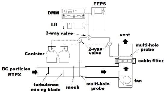 The cabin filter housing unit used in a Dodge Grand Caravan, including the original blower motor, was installed and set up in the laboratory (Figure A1a; Appendix A). Figure 1 shows a simplified schematic diagram of the setup of the experiment. Before entering the cabin filter housing unit, air first passed through a 6-inch flexible aluminum duct. Two turbulence mixing blades were installed inside the duct in order to create the needed turbulence for incoming air flow, enhancing air mixing for both gases and particles. Downstream of the two turbulence mixing blades is a mesh for allowing the well-mixed air flow through the cabin filter housing uniformly.