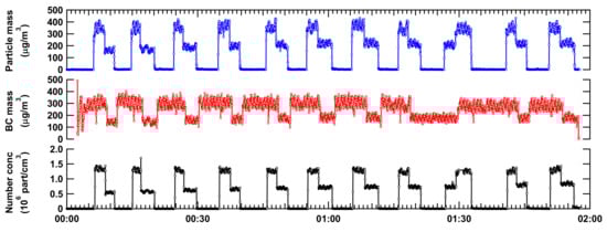Example of the particle number concentration, black carbon (BC), and particulate matter (PM) mass time series from a typical experiment.