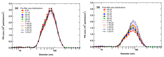 Example of the particle number size distribution measured at the (a) pre- and (b) post-cabin filter locations during a typical experiment.