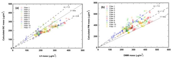 Comparison of the calculated (a) BC mass and (b) PM mass with the measured masses.