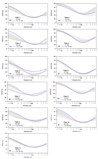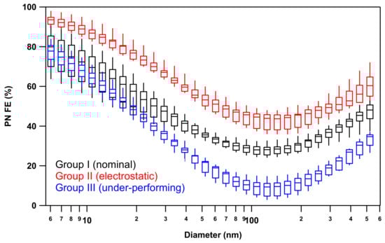 Figure 5 summarizes the PN FE as a function of particle diameter for all 11 filters in a box plot. In general, all FE curves possess a typical inverted V-shape, indicating the minimum FE at about 100 nm. This is similar to what would be predicted from theory and also consistent with the observations from other studies [38,56,57]. There were large variations in filtration performance among different filters. For example, filters 2, 4, and 8 had substantially better filtration performance than other filters. These filters were capable of removing 10 nm particles with close to 100% efficiency. They also provide FE up to 60% for 520 nm particles. The smallest FE of about 40% was observed for 100 nm particles as expected. Importantly, these filters had electrostatic properties, which also explain the high initial collection efficiencies of these filters compared to the non-electrostatic filters and the subsequent reduction in efficiency as the electrostatic charge was shadowed or reduced. Filters 5 and 6 had the worst performance as they typically provided 0% FE at 100 nm-sized particles. For all other sizes, the FE of these filters were typically 10–30% lower than the rest of other filters. The FE for the rest of the filters (i.e., 1, 3, 7, 9, 10, and 11) appears to fall in between the FE for the electrostatic filters and the underperforming filers groups.