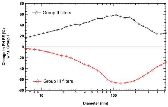 Percentage difference in PN FE for the Group II (electrostatic filters) and Group III (underperforming filters) with respect to Group I (nominal filters).