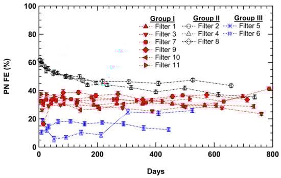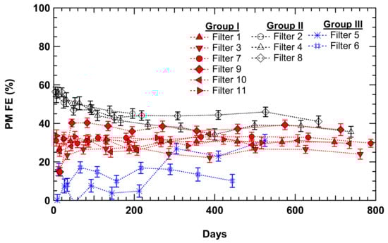Figure 8 summarizes the change in PN FE over time. Data are color coded based on the filter categories identified from the size-dependent FE. Results in Figure 8 show consistent behavior for different filters within the same group. Group I filters represent typical nominal filters, showing relatively flat FE behavior over the course of about 2 years of filter usage. Since observations in Figure 5 show that FE for different sizes did not change dramatically over the course of the experiment, the results in Figure 8 suggest that the relative FE for different sizes for Group I filters are stable over 2 years of usage in real life. Generally, FE for Group I filters varied from 30% to 40%. The formation of dendrites was expected to improve FE over time [27], but observations for Group I filters did not show this behavior. Fibrous filters typically have very low packing density in the range of 1–15% [19] to permit low pressure drop. Therefore, this also means that these filters typically have rather high filter capacity, and the amount of PM generated from this experiment obviously was not enough to significantly change any microstructure of the filter fiber to illustrate the improved FE caused by the formation of dendrites.
