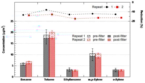 Measured BTEX concentrations at pre- and post-filter locations without cabin filters. Uncertainties are 95% confidence interval error estimates. Dotted lines indicate the reductions in BTEX concentrations at the post-filter location for the different repeats.