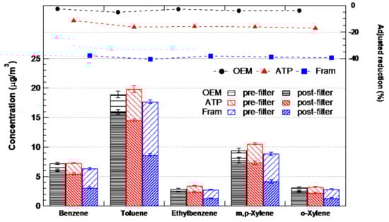 Figure 12 summarizes the BTEX concentrations measured at the pre- and post-filter locations for a charcoal filter (ATP or Fram) and a non-charcoal filter (OEM). Since there is a consistent reduction in BTEX concentration between the pre- and post-filter locations (Figure 11), the averaged reduction amount was subtracted from the total reductions in BTEX concentrations for the all test filters in order to only reflect the change in BTEX concentrations due to the presence of a cabin filter. For the non-charcoal filter, the typical reductions in BTEX concentration were 3–5%. These changes are too small to be considered statistically significant, and they demonstrate that the non-charcoal filters have no impact on gaseous removal. In contrast, the two charcoal filters show significant removal of BTEX concentration, with one showing reductions of 11–17% with the other one showing reductions of 38–41%. These results suggest that even though there are variations in the BTEX removal efficiencies (RE) among different charcoal filters, charcoal filters are indeed useful in removing BTEX by typically more than 11%.