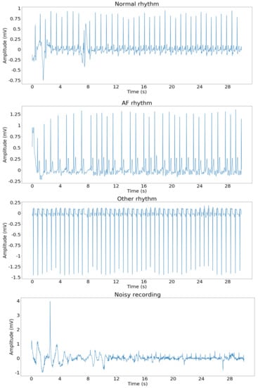 ECG recordings provided for the Physionet 2017 Challenge [28] have been employed herein. The ECG dataset contains recordings obtained with AliveCor’s single-channel ECG device and includes a total of 8528 recordings, each labeled as normal, atrial fibrillation, other abnormal rhythms, or noisy ECG samples. Of the total 8528 ECG recordings, 5076 recordings are labeled as “Normal”, 758 recordings are labeled as “Atrial Fibrillation”, 279 recordings are labeled as “Noise”, and 2415 recordings are labeled as “Other”. Examples of ECG recordings for each category are shown in Figure 1.