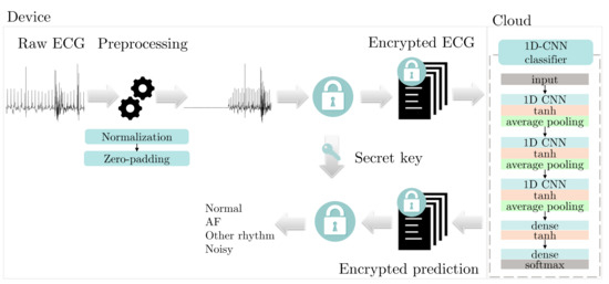 The proposed computer-aided detection system consists of three main components: noise removal, feature extraction, and classification. The feature extraction step relies heavily on the characteristics of the data and cannot be performed in the encrypted format. Therefore, the data preprocessing step must be performed on the device. The proposed workflow is outlined in Figure 2. Before the ECG data are analyzed by the machine learning algorithm, it is preprocessed on the device. The preprocessing step includes noise removal, feature engineering, and data normalization. The resulting information is then homomorphically encrypted with a secret key. Thereafter, the cloud-based machine learning classifier receives only the encrypted form of the data (ciphertext), while the raw data (plaintext) remains private on the device (at the user). Finally, since CipherML provides direct support for floating-point arithmetic and all operations performed within the neural network are formulated by exploiting the homomorphic properties of MORE, the network can be further used for detection. This network produces encrypted results that can only be interpreted after decryption with the secret key.