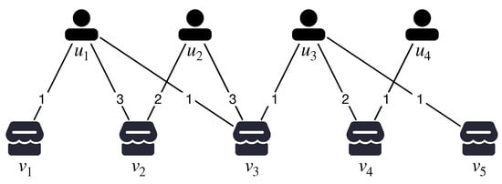 Figure 1 is a toy weighted bipartite graph for modeling the customer–product affiliations. It consists of two layers of nodes, i.e., the four nodes in the left layer denote the customers and five nodes in the right layer denote the products. The edges between nodes represent the purchase relationships and the weight of edges reflects the purchase frequency. Given the query parameters and , we can obtain consisting of nodes .