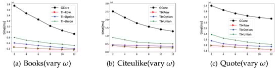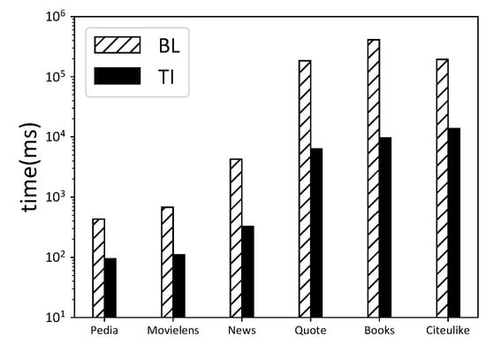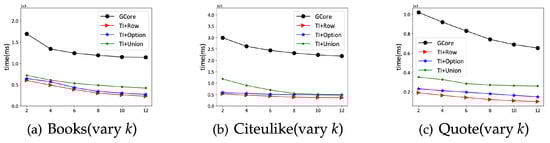 Datasets: We employed six real-life networks, i.e., Pedia, Movielens, News, Quote, Books and Citeulike, which have been widely used in previous studies (e.g., [2,3,15]) and are publicly available at http://konect.cc/networks/ (accessed on 20 May 2021). Table 2 provides the statistical details of the datasets. For a query with a given pair of parameters k and , we ran the algorithms over each dataset 200 times and reported the average value. All the programs were implemented in C++ and the experiments were performed on a PC with an Intel Xeon 3.2 GHz CPU and 32 GB RAM.