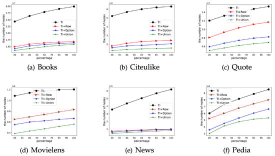 Evaluation of the index space: In this experiment, the space costs are compared among the four index-construction algorithms, i.e., TI, TI+Row, TI+Option and TI+Union. Note that the space storage is measured by the number of nodes stored inside the index. Similarly, we vary the percentage of nodes in each dataset. The results are shown in Figure 5. As observed, with the increase in nodes involved, more index space is required for all the algorithms. Obviously, the space cost of TI+Union is much less than that of TI, which can save up to 7X space in the News dataset. As expected, TI+Union greatly outperforms TI+Row and TI+Option, for it can omit the largest number of unpromising copies of nodes. The rank of the space cost for these methods is: UnionIndex < OptionIndex < RowIndex.