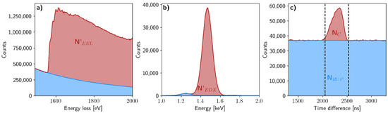 (a) Conventional electron energy loss (EEL) spectrum where the K-edge of aluminum is shown from an Al-Mg-Si-Cu alloy. The background is subtracted using power-law fit (blue area). The background is used to determine . (b) The conventional energy dispersive X-ray (EDX) spectrum where the main peak is a characteristic peak of aluminum. The background value is determined by fitting the spectrum to the sum of three Gaussian’s and a linear slope from which one Gaussian peak is the peak of interest. (c) Histogram of the number of correlated events as a function of time difference between the X-rays and electrons. The number of identified coincidence events is indicated on the figure.