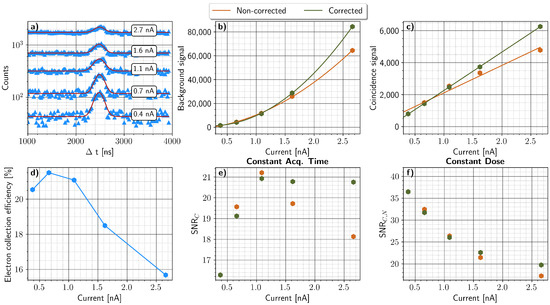 (a) Coincidence histograms as a function of time delay between EELS and EDX event streams for a varying beam current at constant acquisition time (y scale logarithmic). (b) The uncorrelated background signal as a function of incoming beam current (brown). The background scales quadratically with incoming current. In green, the corrected expected background signal which would be recorded for an ideal electron detector with constant efficiency as a function of current. (c) The number of coincidence events as a function of incoming current scales only linearly with incoming current. The corrected signal taking the efficiency into account is shown (green). Please note that the corrected fit better approximates a linear function. (d) The measured electron efficiency with a notable decrease for higher currents due to dead time in the detector. (e) The SNR of the coincidence signal as a function of incoming current when using a constant acquisition time. (f) The signal-to-noise (SNR) of the coincidence signal as a function of incoming current when the total dose has been fixed.