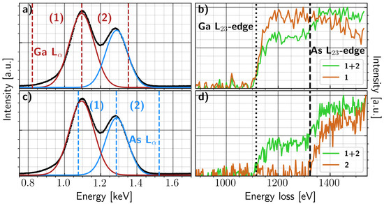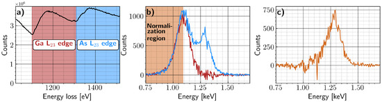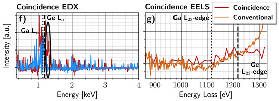 The methodology used for background-free EELS can also be applied to EDX spectra. Although the presence of a background signal in EDX is quite limited, there is an issue when due to the poor energy resolution, different peaks start overlapping. The standard method to disentangle these peaks is to use a deconvolution method [21,31,32]. However, with this method caution should be taken since artefacts can arise [32]. The coincidence method gives the ability to subtract other X-ray lines by selecting a particular EEL energy window and creating the X-ray spectrum using X-rays inside and outside the time coincidence window. In Figure 5a, the conventional EEL spectrum from a GaAs semiconductor is shown where the different edges are indicated. In Figure 5b, the background-subtracted EDX spectra are shown where the electron energies are indicated on (a). The red spectrum only uses electrons arising from the Ga L23 edge which makes that only the X-rays originating from Ga are visible. When taking electrons with energies inside the blue region, both X-ray lines are seen. This is because the EEL edges are delocalized which makes that in this energy-loss region electrons arising from both the interaction with Ga and As are located. A method to disentangle the As L from the Ga L spectrum is to normalize both spectra from Figure 5 in the region where only the Ga L X-rays are present. Then the coincidence X-ray spectrum, with both electrons coming from Ga and As, is subtracted with the coincidence X-ray spectrum where only the Ga electrons are present resulting in an X-ray spectrum containing only X-rays from the As L line. Another advantage of the coincidence method compared to conventional EDX is that it removes the phosphorescent X-rays since the energy loss of the correlated electron does not correspond to the expected edge. This improves the accuracy of the quantification and further investigation needs to be done to confirm this hypothesis.