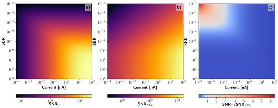 where a, b and c are the multiplicative constants which makes the notation easier. Equation (7) is a monotonically increasing function. Hence when performing experiments, maximizing the current maximizes the SNR which also applies for conventional EELS or EDX. However, in the limit of infinite current, the SNR converges to which indicates that at some point, which depends on the parameters, no gain in SNR is expected by increasing the current. However, increasing the current is not always viable due to the occurrence of electron beam damage for some materials.