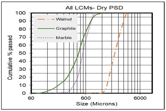 The materials’ dry phase PSD results and analysis were conducted on the three different granular materials of LCMs (walnut, graphite, and marble). The five particle size distributions (Ds) and the span (the difference between D90 and D10 divided by D50) of all LCMs are shown in Table 4, and their cumulative distributions are plotted in Figure 1. Walnut showed much larger particle sizes than graphite and marble, with a median particle size of 2060 µm, which is around 4 times larger than the median particle sizes of graphite and marble particles (445 µm and 545 µm, respectively). Furthermore, graphite showed the largest span of 1.31, indicating a much wider particle size distribution than walnut and marble (0.75 and 0.78, respectively).