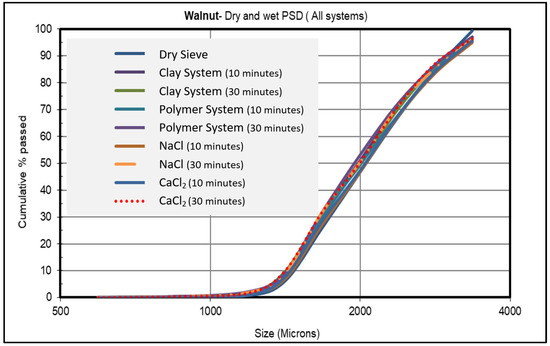 As noted earlier in this study, walnut is a highly rigid material that has been used in drilling fluids for decades. The analysis conducted on the walnut showed that the particle size range of the dry phase was from 3360 to 595 µm. As shown in Figure 2, the overall performance of walnut with different carrier fluid systems showed that walnut performed with a very minimal size reduction in all fluid systems. Thus, the selection of the fluid type was not a critical issue that would influence the size degradation behavior of walnut.