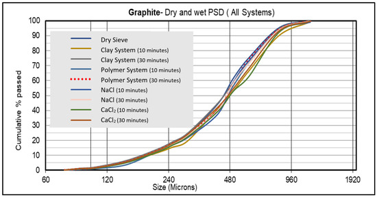 Graphite is a resilient, dual composition, and carbon-based material. It has a unique characteristic that imparts resiliency and the ability to recover its initial size and volume up to 120% [22]. During the dry particle size distribution experiment on graphite, the analysis showed that the particle size ranged from 1190 to 74 μm. The overall performance of graphite with the different carrier fluid systems showed that the material performed with a very minimal size reduction with all carrier fluid systems and that the carrier fluid types did not affect the graphite size degradation performance, as shown in Figure 3.