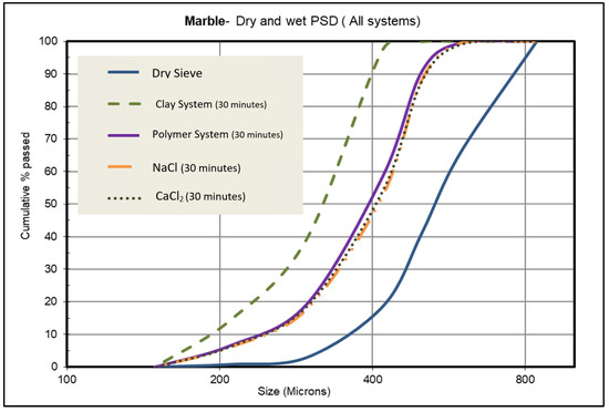 Dry and wet PSD of marble in the four carrier fluid systems with 30 min shearing intervals.