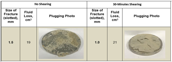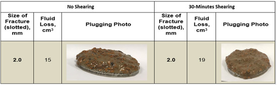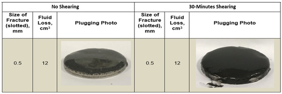 While studying the plugging efficiency of graphite, it was observed that the material was able to plug a maximum fracture width of 0.5 mm and maintained the same fluid loss volume both for situations of shearing and without shearing. The size degradation did not affect the material performance in plugging the fracture width size because the graphite did not experience any fluid loss, as shown in Figure 6.