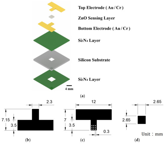 Designs of MEMS-based pyroelectric infrared sensors: (a) structural arrangement of sensor, and dimensions of (b) bottom electrode, (c) top electrode and (d) sensing layer.